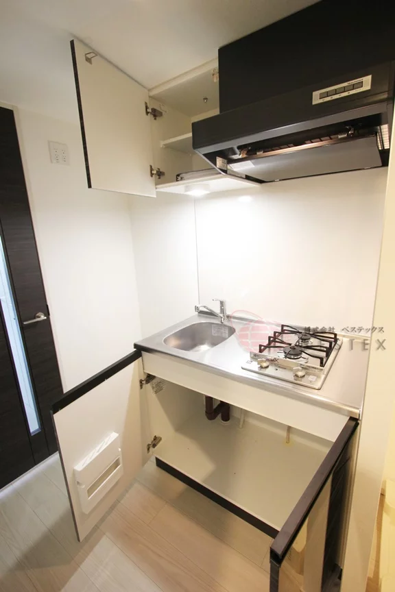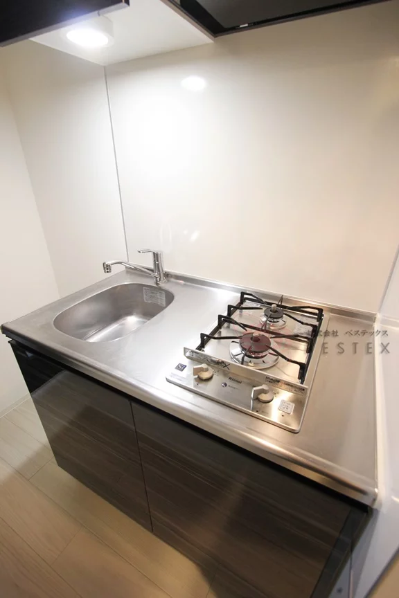 水回りはシンプルかつ機能的な設計になっており無駄なスペースはありません。キッチンは2口のガスシステムキッチンです。