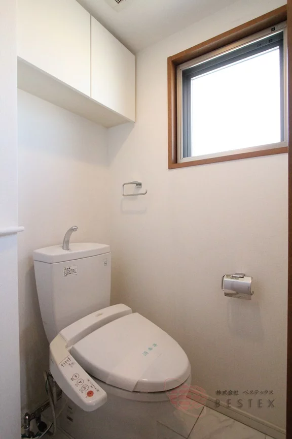 トイレは温水洗浄機能付きで清潔♪吊戸棚の収納もあり便利です。また、こちらも窓付きなのが嬉しい仕様!