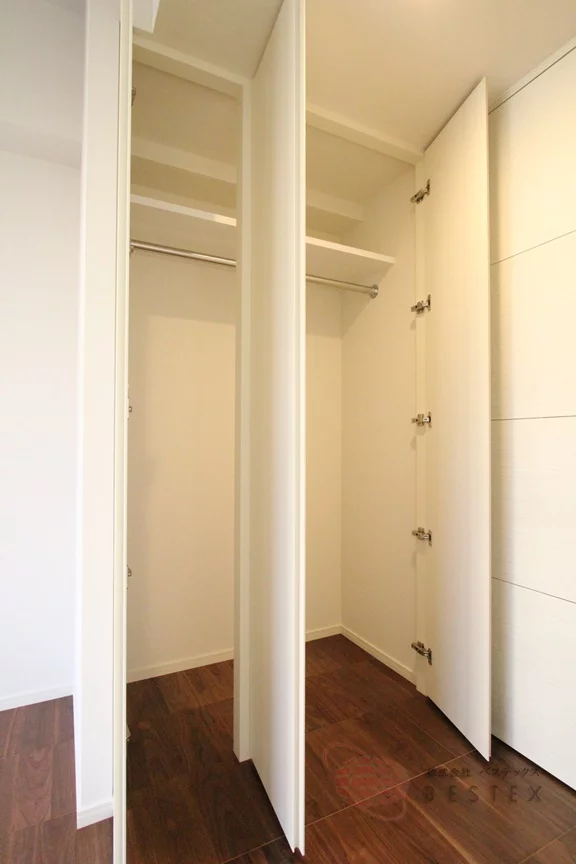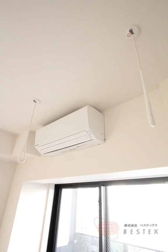 洋室には大きめなクローゼットやエアコンも完備。天井からは室内物干し器具が下がっており、雨の日など洗濯物の部屋干しにも対応可能!