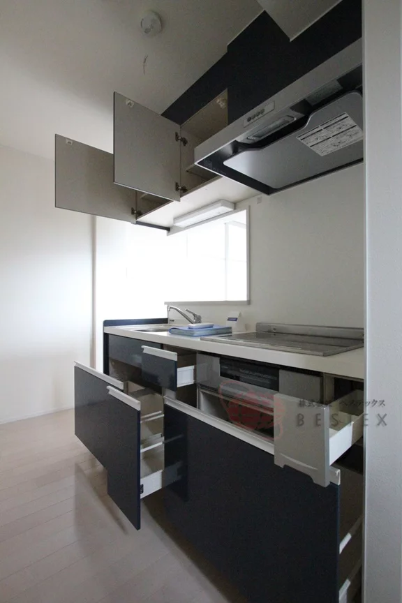 キッチンは人気のカウンターキッチンを採用!IH2口&ラジエントヒーター1口のシステムキッチンはグリル付きで、スペースも広くお料理も快適!