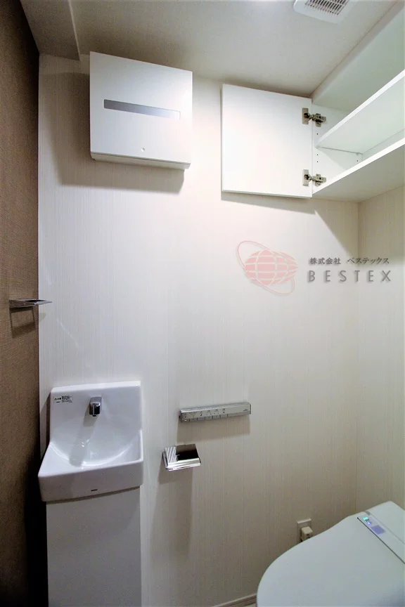 トイレは洗面室・浴室からは離れた位置にあり、温水洗浄便座付き!吊戸棚の収納もあり便利です!