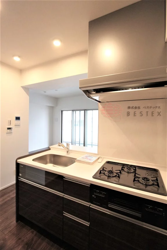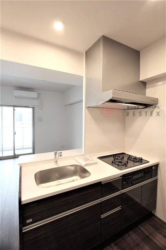 キッチンはグリル付き3口ガスコンロのシステムキッチンで、お料理も快適です。冷蔵庫だけでなく食器棚を置けるようなスペースの余裕も御座います!