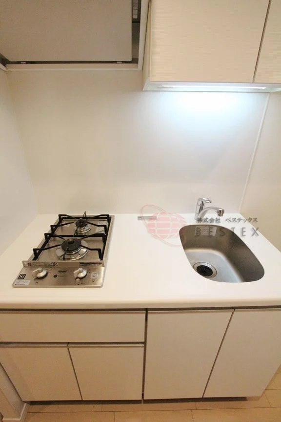 キッチンは約2帖のスペースがあり、ガス2口のシステムキッチンでお料理も快適!