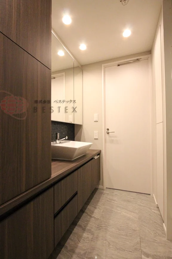 脱衣洗面所・浴室・トイレは全て独立設計!広い脱衣洗面所には大きな棚付きの独立洗面台と、こちらも棚付きの洗濯機置場があるので、洗剤やタオルなどの収納にとても便利!