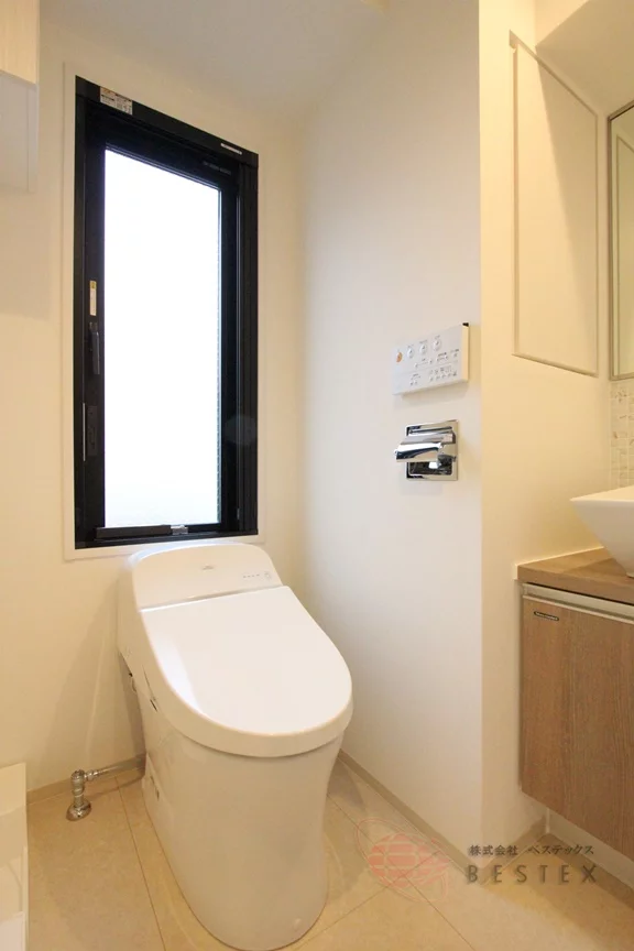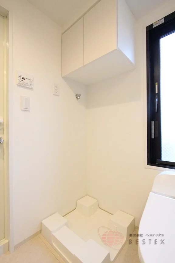 洗面所には独立洗面台と温水洗浄便座付きのトイレ、室内洗濯機置場があり、吊戸棚・リネン庫などの収納も完備!