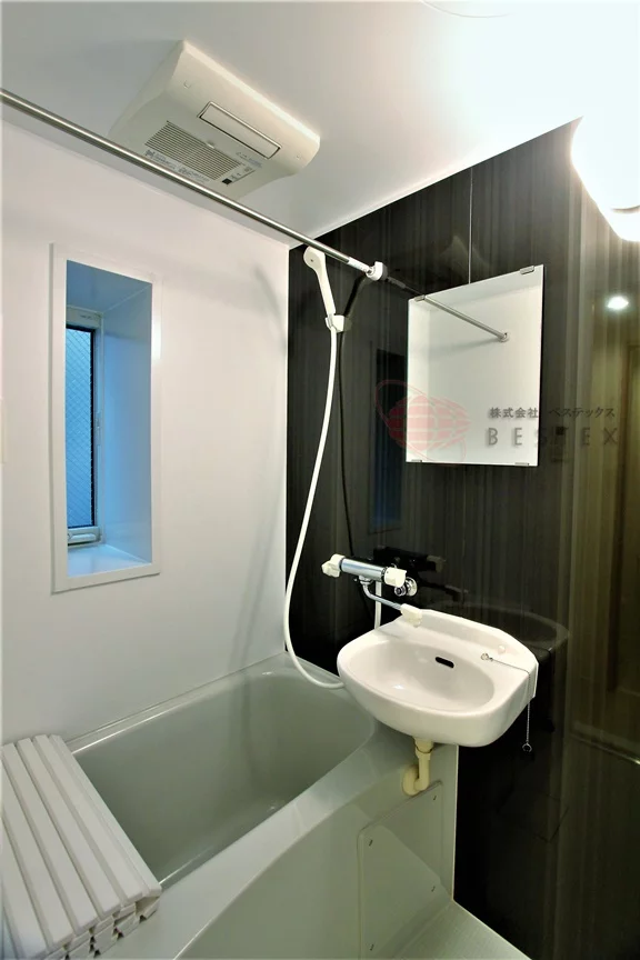 バスルームは洗面台とセットになった二点ユニットになっており、浴室乾燥機と追い焚き機能もついております。