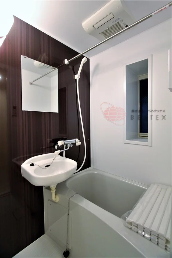 バスルームは洗面台とセットになった二点ユニットになっており、浴室乾燥機と追い焚き機能もついております。