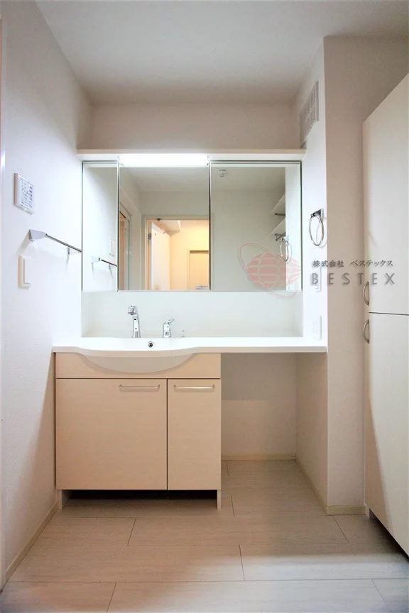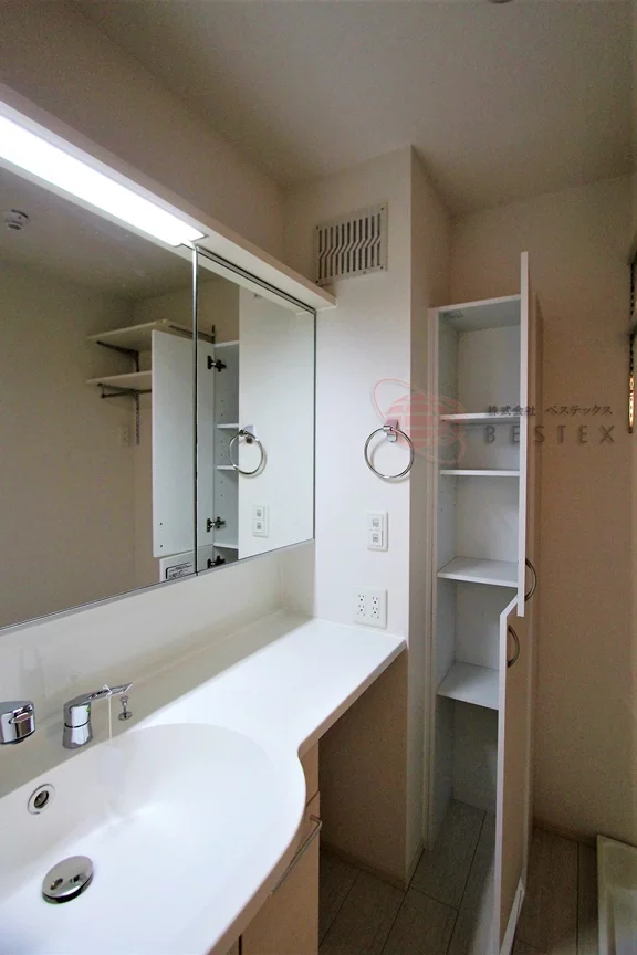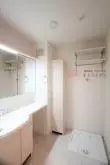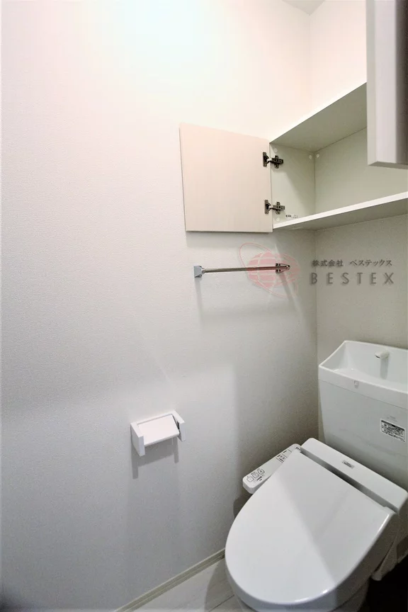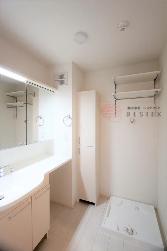 水まわりもゆとりを持った造りで、トイレや洗濯機置場にも吊戸棚収納があり、広い洗面室にはリネン庫も完備。