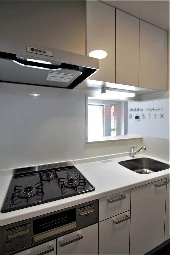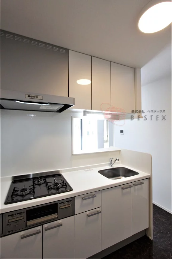 グリル付き3口ガスコンロのシステムキッチンはお料理も快適に行え、冷蔵庫以外に食器棚などを置けるスペースも御座います。