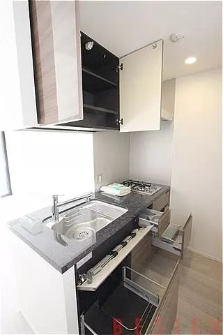 キッチンはカウンタータイプのグリル付きガスシステムキッチンで、天然御影石の天板にワイド・静音シンク、ディスポーザ、食器洗い乾燥機、浄水器一体型水栓など、お料理・家事のはかどるハイグレード仕様!