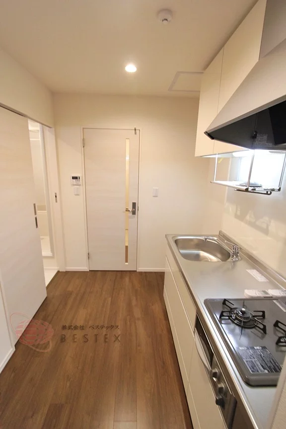 キッチンはガス2口コンロのシステムキッチン。