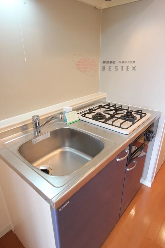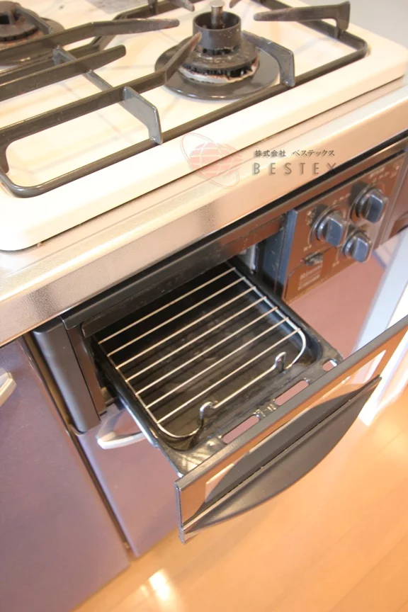 キッチンはグリル付きの2口ガスコンロでお料理も快適!収納力も一人暮らしの食器類をしまう分には十分。