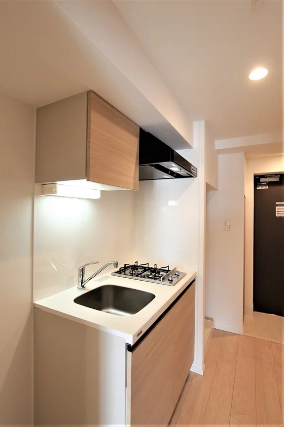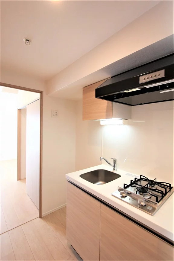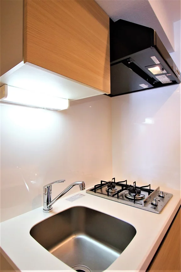 キッチンは2口ガスコンロが備わったシステムキッチンで、