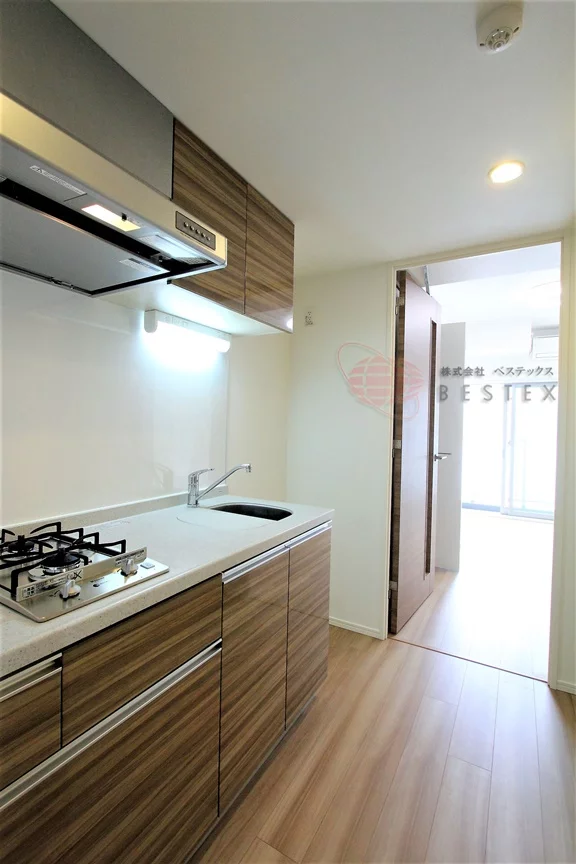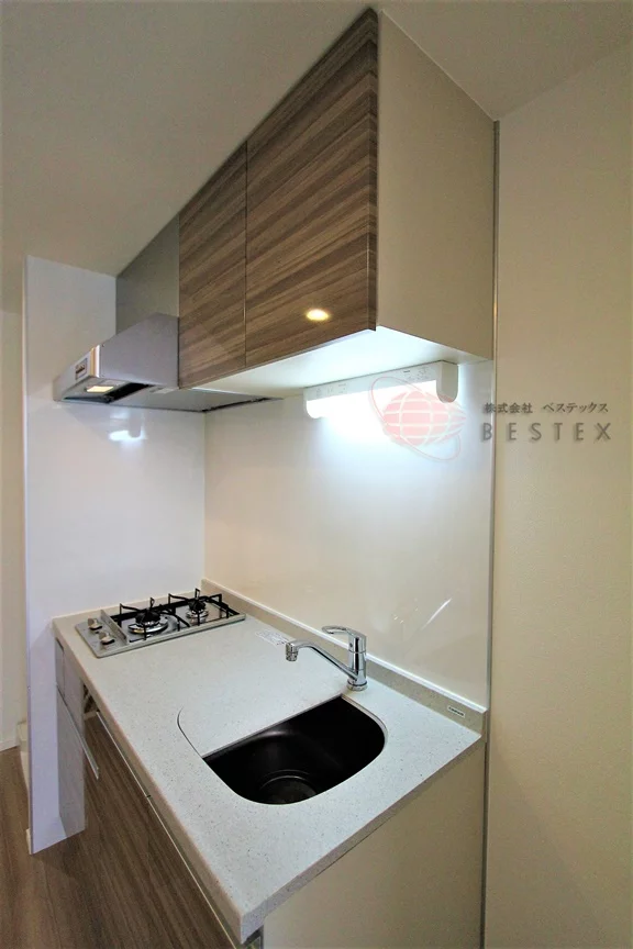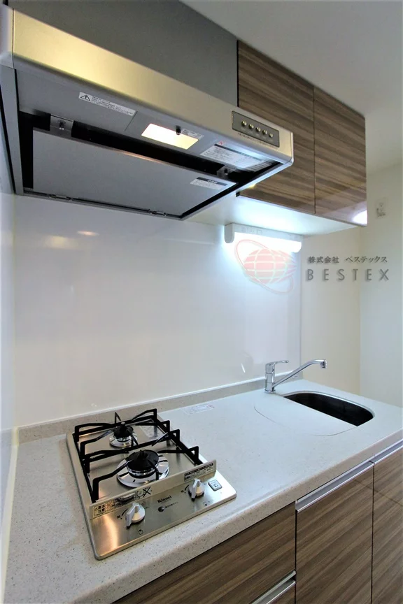 キッチン設備は2口のガスコンロが備え付けられたシステムキッチンになっています。