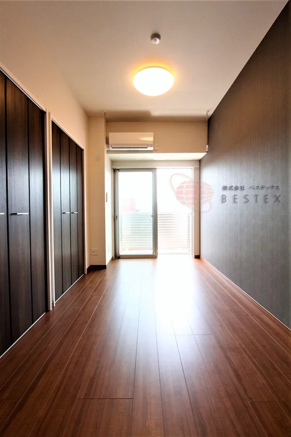 洋室は5.2帖、バルコニーがついておりますので布団や洗濯物を干すことができます。無駄な梁や柱もなくスッキリした形のお部屋なので家具の配置がしやすそうです。大きめのクローゼットが2つついており、洋服や家電などもたくさん仕舞えます。