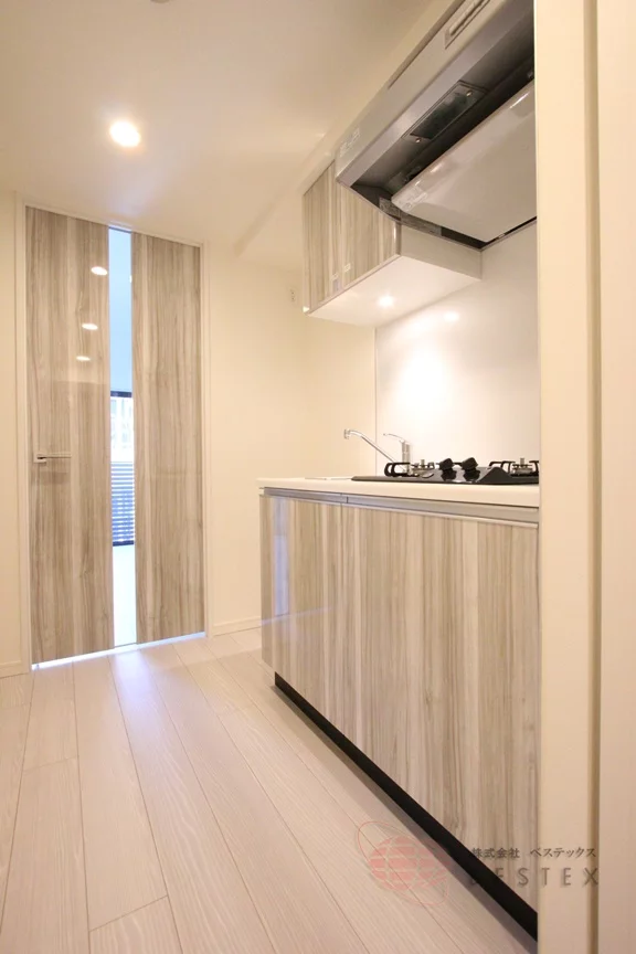 キッチンは2口ガスコンロのシステムキッチンで、中央の調理スペースも確保できるようになっているので、お料理も快適♪