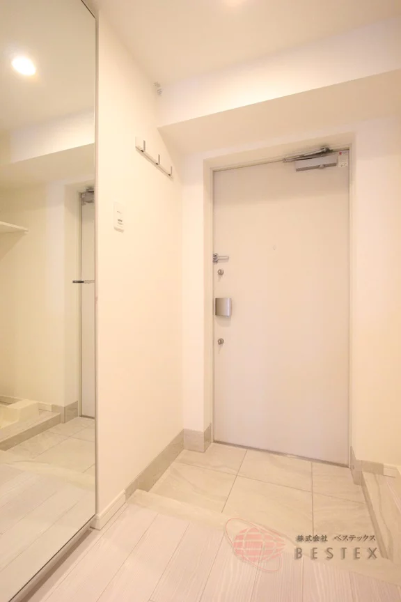 玄関には姿見鏡があるので、お出かけ前の身嗜みもチェックできます!また、姿見鏡自体は扉になっており、中にあるシューズボックスも大きめで靴の多い方でも安心!