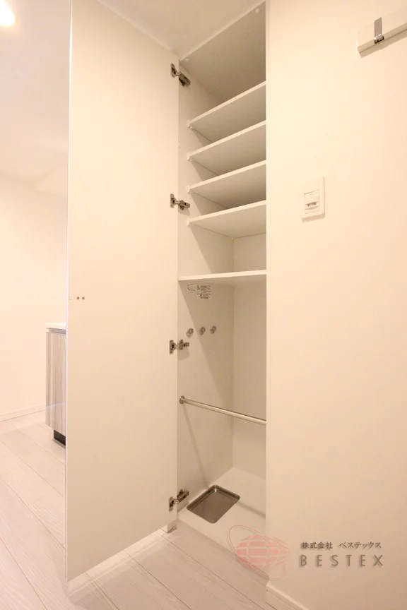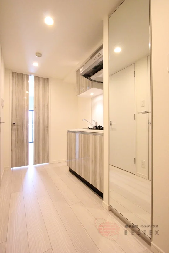 玄関には姿見鏡があるので、お出かけ前の身嗜みもチェックできます!また、姿見鏡自体は扉になっており、中にあるシューズボックスも大きめで靴の多い方でも安心!
