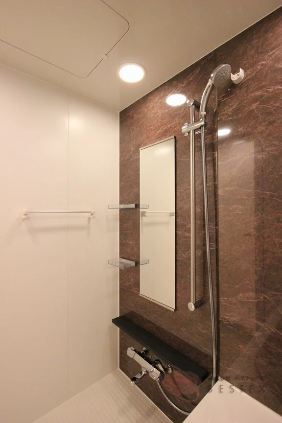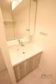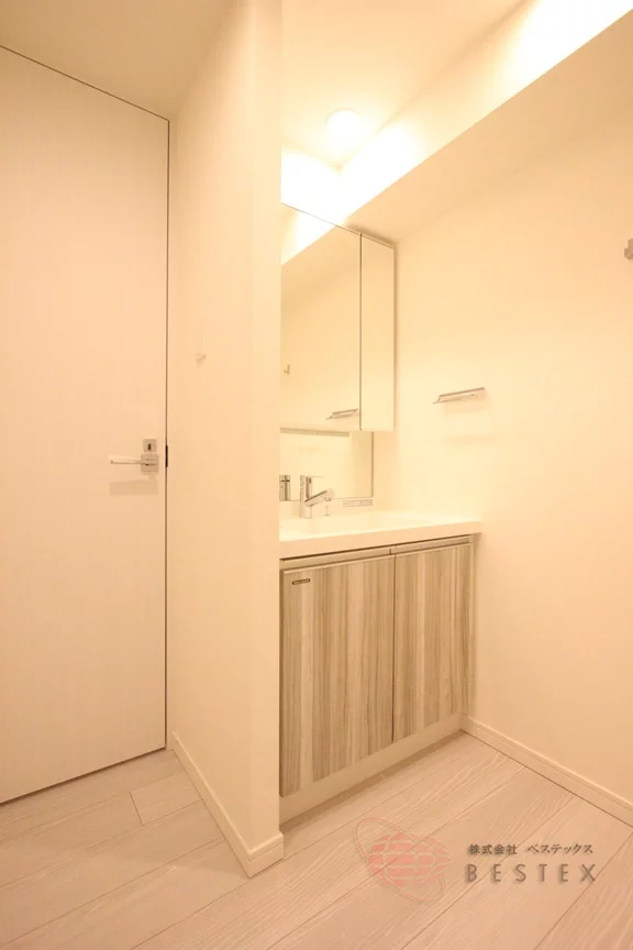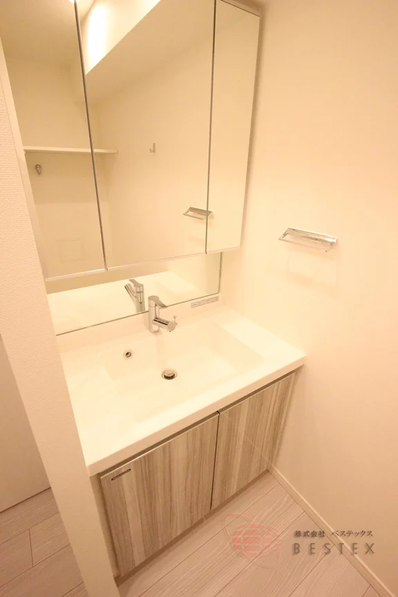 水まわりもやはり充実の内容!トイレ・浴室・洗面室は全て独立した使いやすい配置で、トイレには温水洗浄便座と吊戸棚付き。独立洗面台は三面鏡仕様で、収納も付いています。