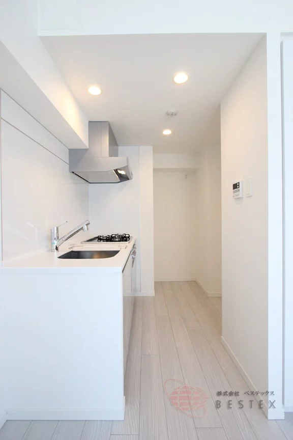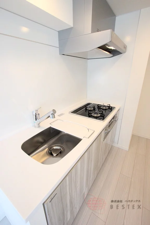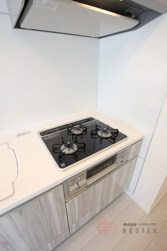 キッチンは3口ガスコンロのシステムキッチンで、調理スペース含めた広さもあり、収納も豊富に備わっています♪