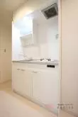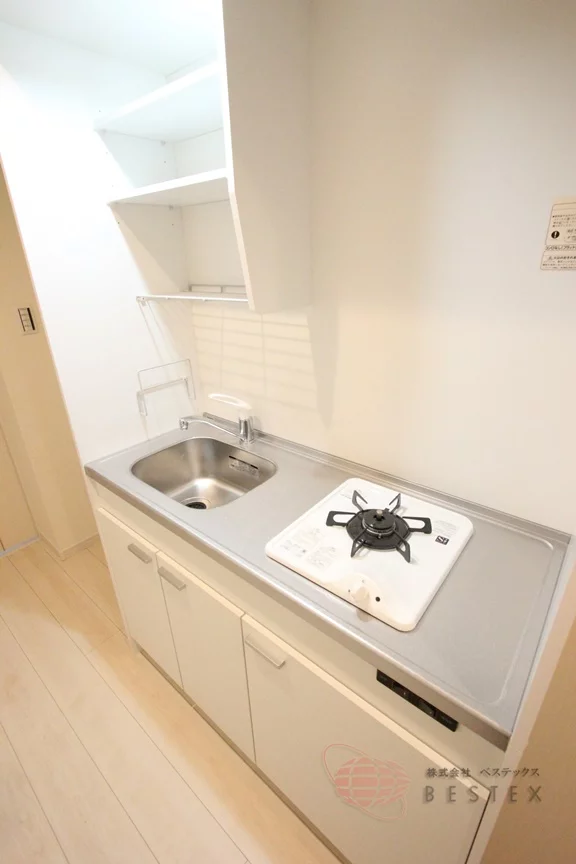 キッチンは1口ガスコンロのシステムキッチンで、シンク・コンロまわりの空間に余裕があり、食器類を収納するスペースもしっかりと確保されています!