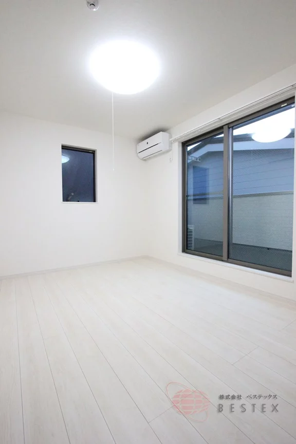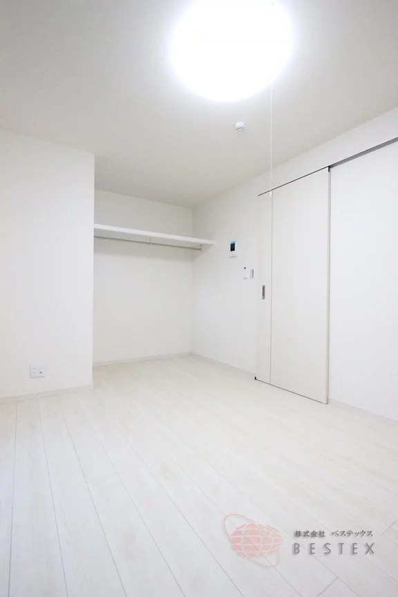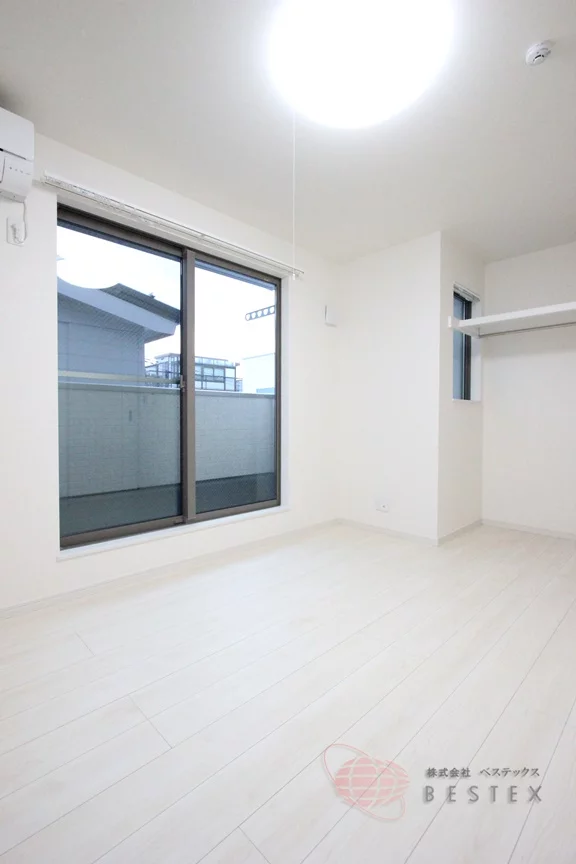 エアコンも設置済みで、季節を問わず快適に過ごせます。収納も、幅の広いハンガーパイプに衣類をたくさん掛けておけ、下部のスペースには衣装ケースやカラーボックスを置く余裕もあるので、室内をより広く使うことが出来ます!