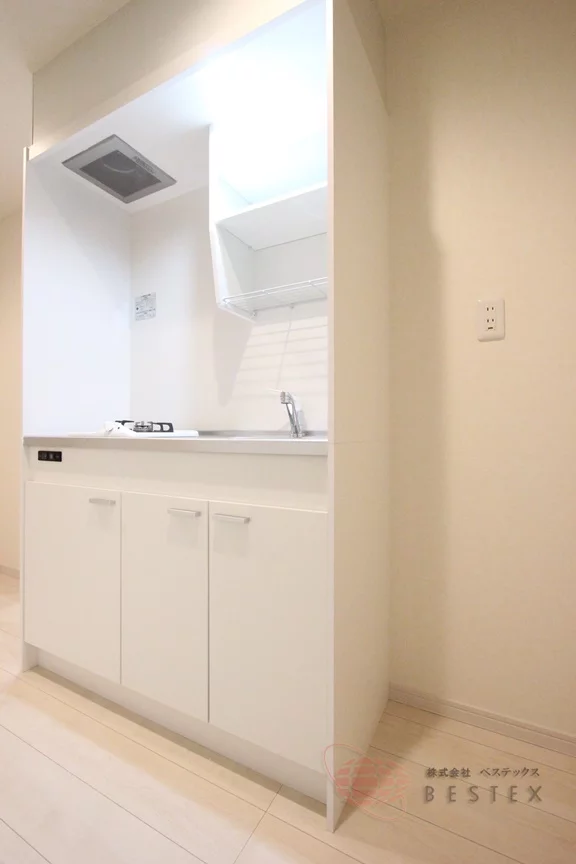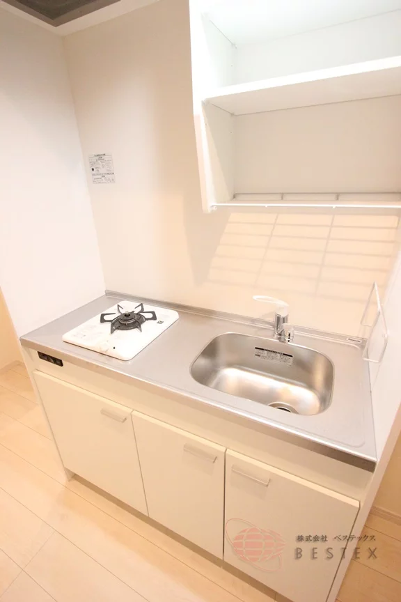 キッチンは1口ガスコンロのシステムキッチンで、シンク・コンロまわりの空間に余裕があり、食器類を収納するスペースもしっかりと確保されています!