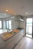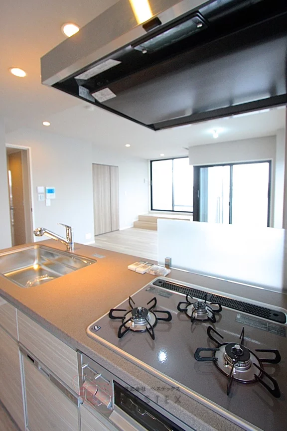 キッチンはシステムキッチン3口コンロ、グリル付きでシンク・調理スペース共に、