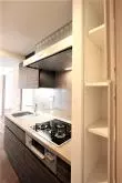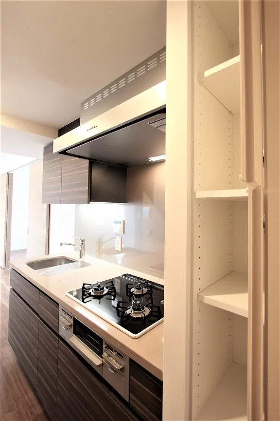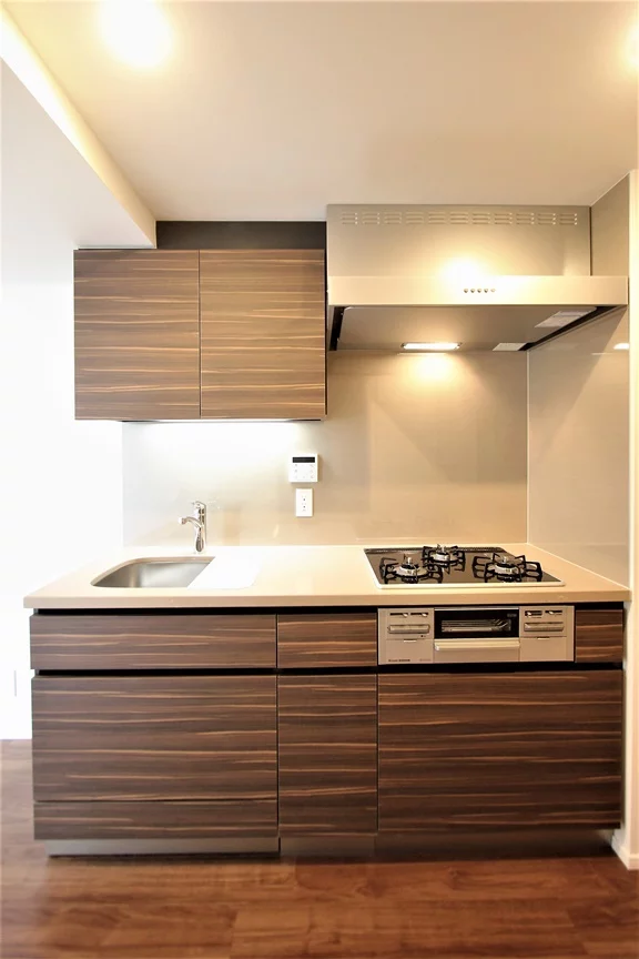 キッチン部分には3口ガスコンロのシステムキッチンがあり、振り向けば冷蔵庫があり(注)、作業効率もあがる空間です♪