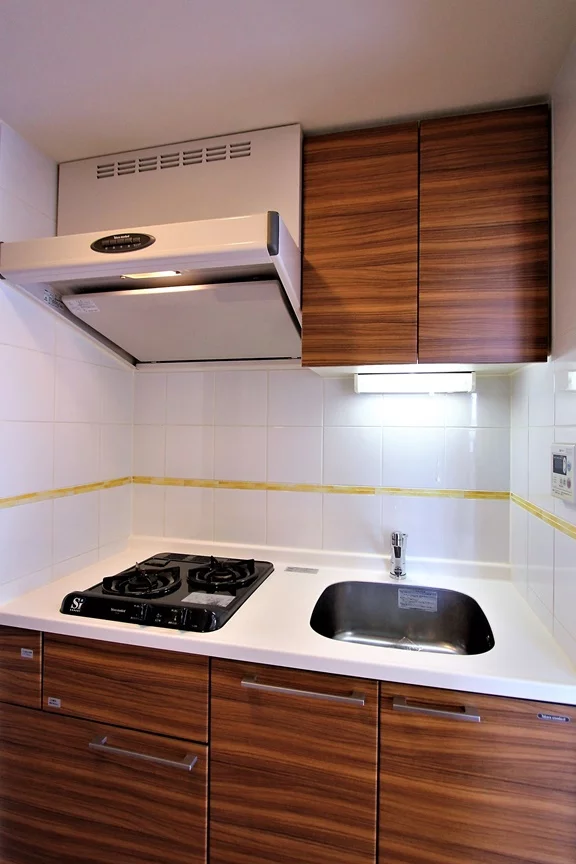 キッチンは料理に便利なガス2口キッチンになっております。収納面では、調理器具をたくさんお持ちでも十分に収まります。
