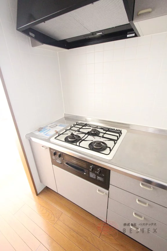 グリル付き3口ガスコンロのシステムキッチンはシンク・調理スペースもそれぞれ広々としており、お料理もはかどる仕様です♪
