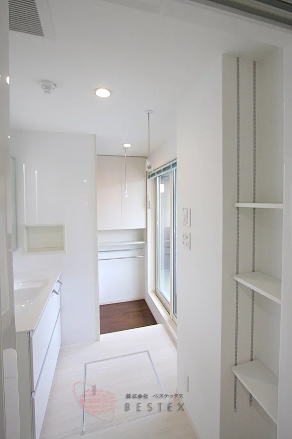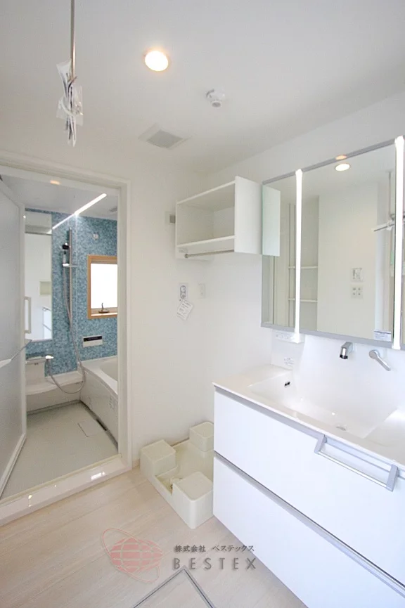 洗髪洗面化粧台に加え、棚をはじめとした収納も完備!