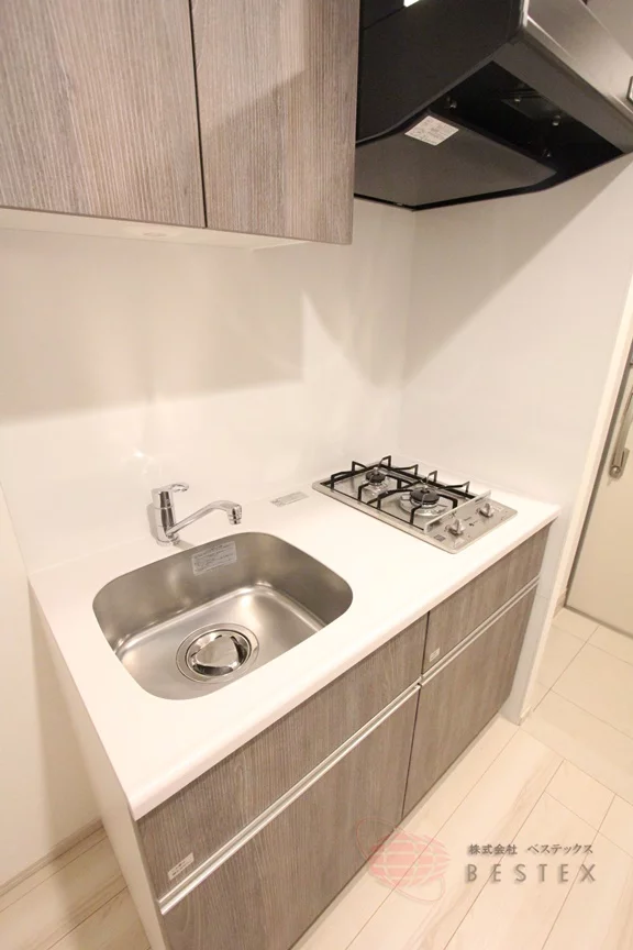 キッチンは2口ガスコンロのシステムキッチンで、食器類をしまえる収納スペースも確保済み!お料理も快適です♪