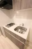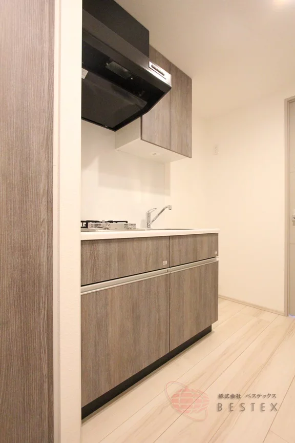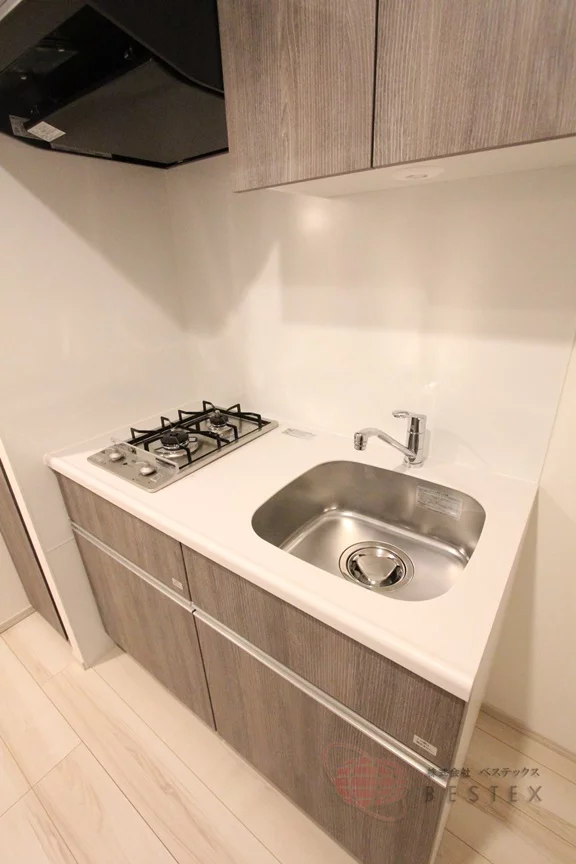 キッチンは2口ガスコンロのシステムキッチンで、食器類をしまえる収納スペースも確保済み!お料理も快適です♪