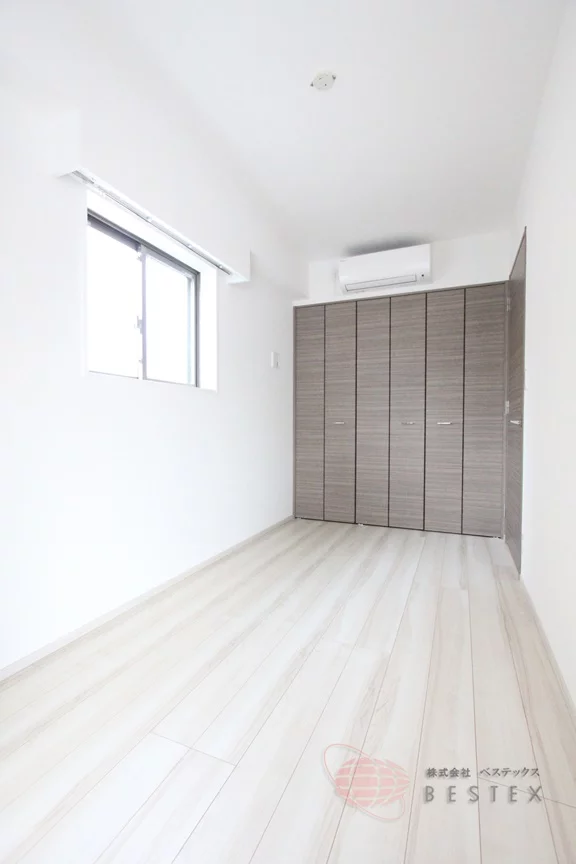 寝室は約5.0帖の洋室で、こちらには壁一面を利用したクローゼットが御座います。
