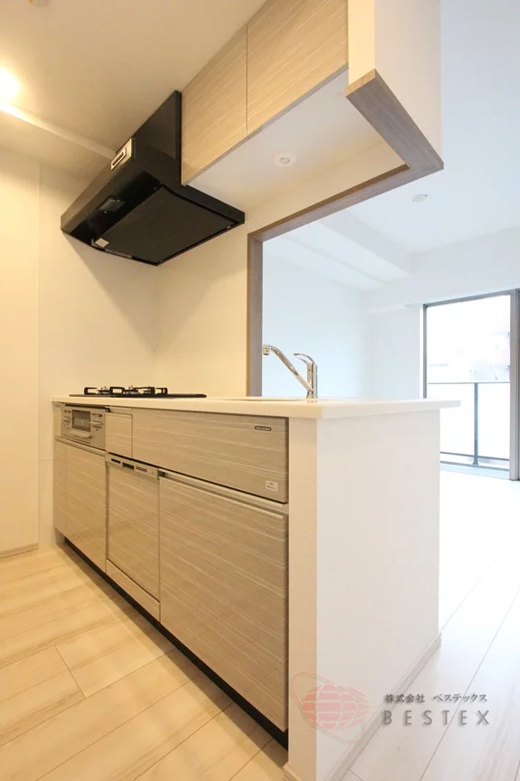 キッチンはグリル付き3口ガスコンロのシステムキッチンで、食器洗浄乾燥機まで完備された充実の仕様!面倒な洗い物も楽々♪