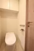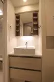 洗面室にはトイレと独立洗面台があり、トイレはウォシュレット一体型です。