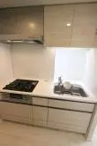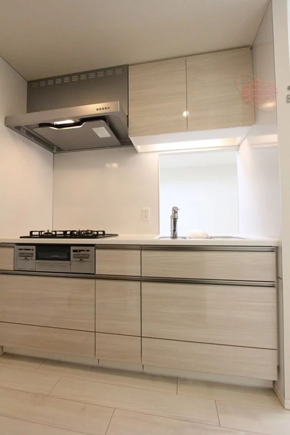 リビングダイニングから奥まったキッチンは収納も豊富に備わったグリル付き3口ガスコンロのシステムキッチン!