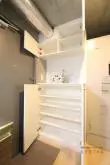 小さめの収納スペースに加え、ハンガーパイプ付きの棚も備わっています!