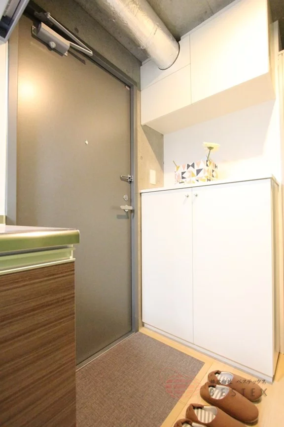 玄関には十分なサイズのシューズボックスがあり、その横には電気温水器があります。