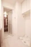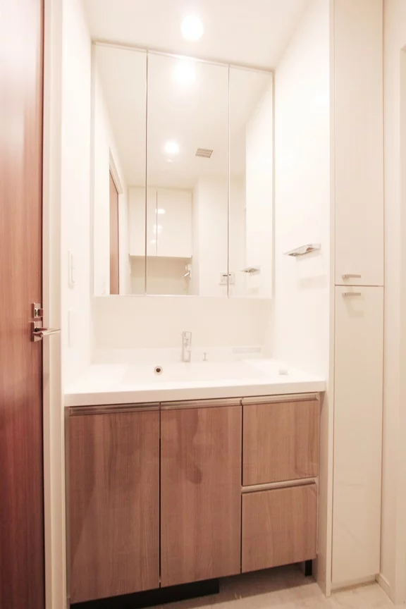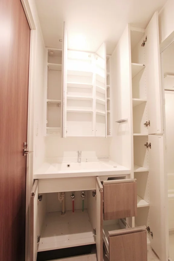 水回り設備も充実しており、追い焚き機能・浴室乾燥・暖房・涼風・換気機能付きのお風呂と2人入居でも使いやすい仕様の完全セパレートのウォシュレット機能付きトイレとなっており、さらに独立洗面台は三面鏡仕様で鏡の内側にも収納がございます。