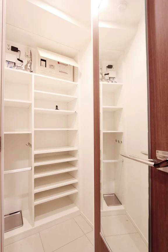 収納力もあるお部屋で玄関先には、シューズインクローゼット・居室にはウォークインクローゼットがついており、洗面台などの水回りスペースも収納がございます。