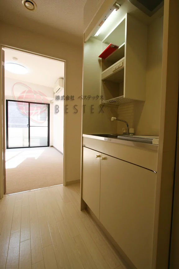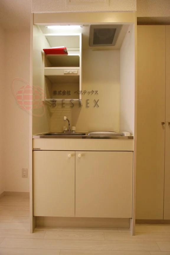 キッチンは廊下部分にあり、IHクッキングヒーターが1口のキッチンとなっており、お料理後のお掃除もサッと拭くだけで簡単♪火災の心配も少ないので初めての自炊という方でも安心です!