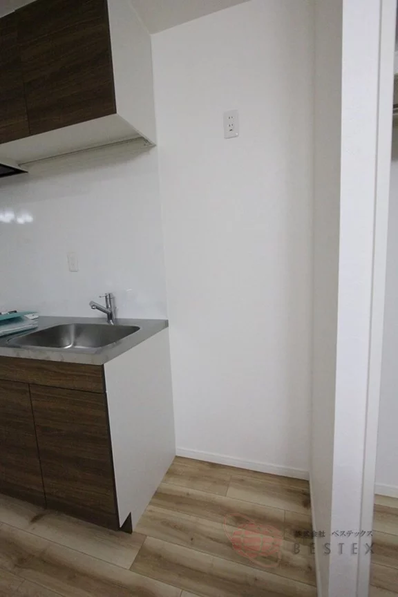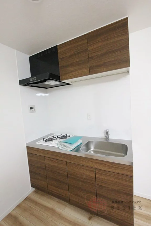キッチンは2口ガスコンロのシステムキッチンを採用!お料理もはかどり、収納スペースも完備されているので食器類も片付いて使い勝手良好♪キッチンの横には別途収納も付いています。