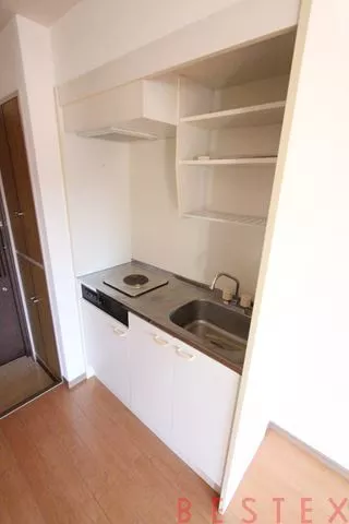 キッチンは、一口電気コンロが設置済み。その他調理スペースや収納など充実しています。