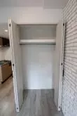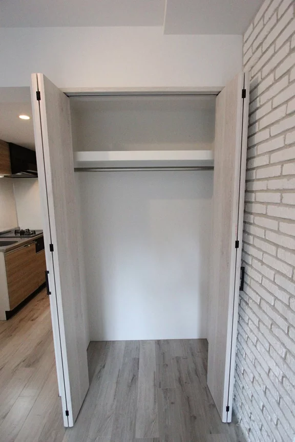 白を基調としたフローリングで明るい印象のお部屋となっております。また、レンガ調のデザインのおしゃれな壁紙です。