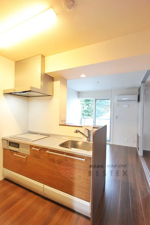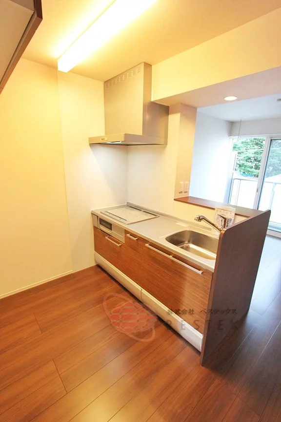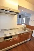 キッチンはIH3口システムキッチン(1口ラジエーター、2口IH)。