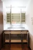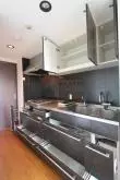 注目ポイントはキッチン部分です。グリル付きの3口ガスコンロで調理スペース・収納スペースが十分されており、冷蔵庫・電子レンジもキッチンスペースにおけるので効率的にお料理を進めることができます。