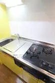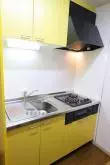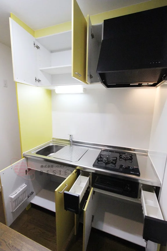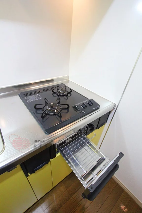 ②.キッチンは、2口ガスコンロ+グリル付きのシステムキッチン!