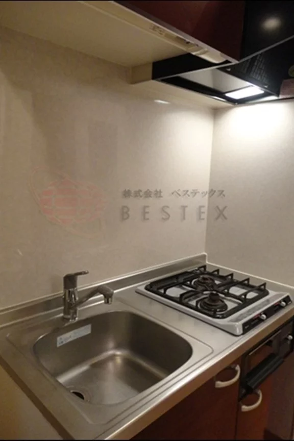 キッチンは2口のガスコンロ付きのシステムキッチンとなっており、収納量も問題ありません。